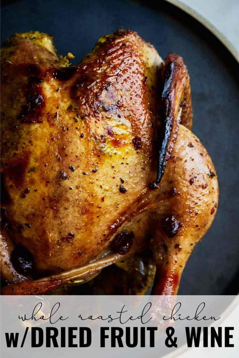 Whole Roasted Chicken with Dried Fruit and Wine is the most incredibly juicy and tasty roasted chicken. My mom’s amazing recipe is here to save your day. Pop all the ingredients in a pot, marinate the chicken overnight to infuse the flavors, and this succulent chicken is on the table with ease.