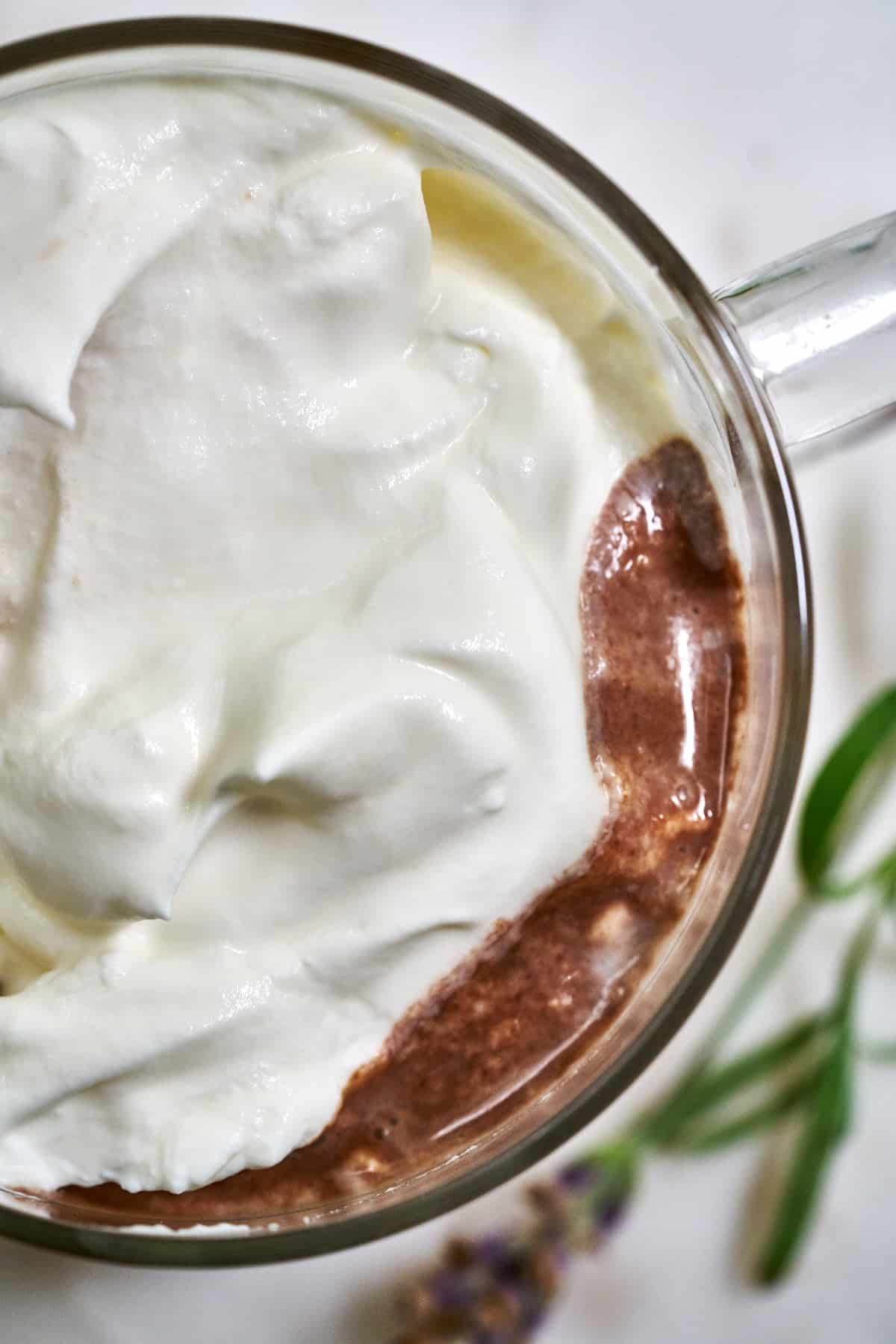 Add the hot chocolate to your favorite mug, and top with the lavender whipped cream.