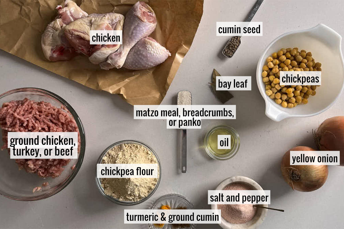- In the meantime, mix the ground chicken (or turkey or beef), grated onion, 1/2 cup water, 1/4 cup oil, matzo meal, ground cumin, 1/4 teaspoon turmeric, salt, pepper, and chickpea powder. Mix thoroughly without over-mixing. The mixture should feel soft and elastic.1 lb. ground chicken or dark meat turkey, 6 oz. chickpea flour, 1 yellow onion, 1/4 cup flavorless oil, 1 tbsp matzo meal