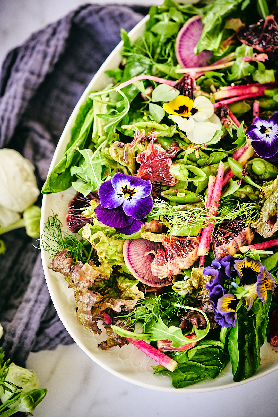 This delectable spring herb salad with pomegranate miso dressing holds a special place in my heart, and I’m pretty sure it will become your new favorite salad dressing! Edible flowers are an optional addition, but a fun one!