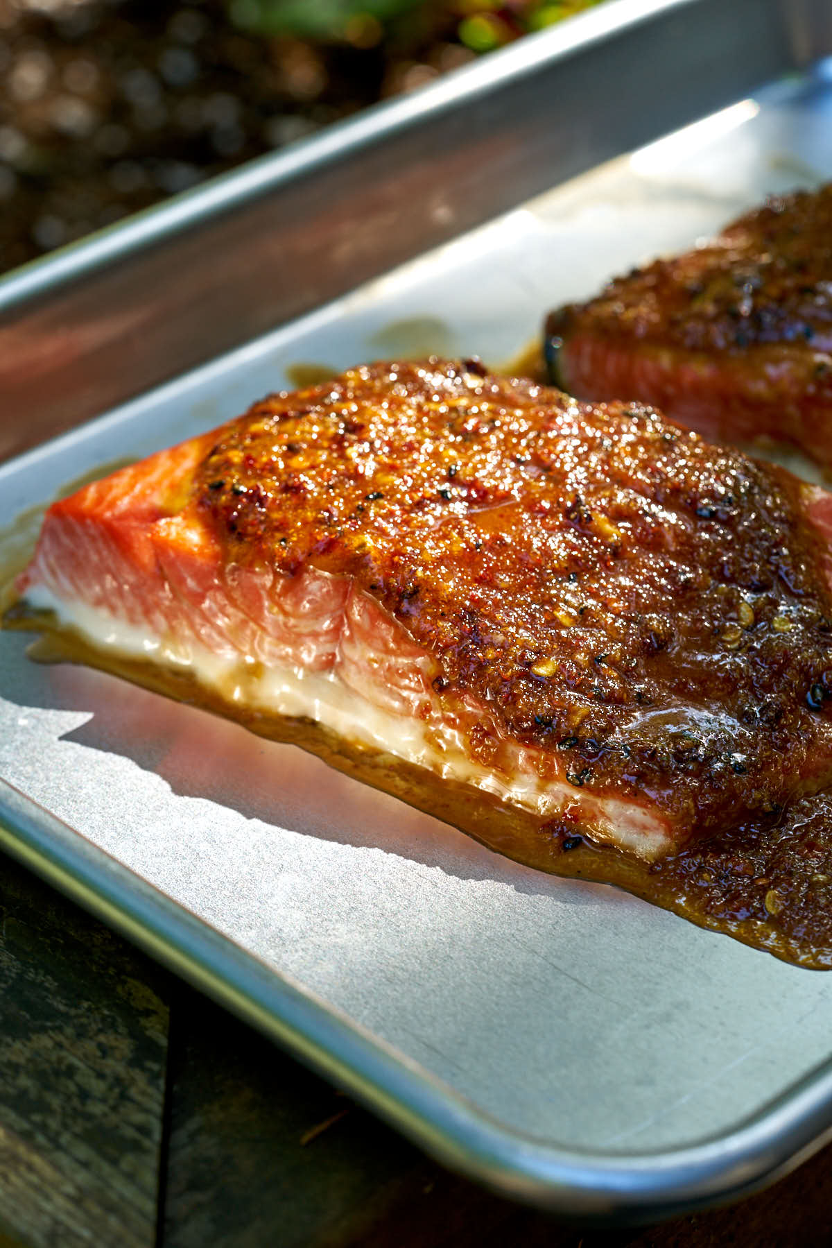 Any marinade that’s acidic, like citrus juice or vinegar, should not be left overnight. These marinades should be applied a maximum of thirty minutes before cooking. Non-acidic marinades, like the one in this recipe, can be left overnight to infuse the salmon with flavor. Try to use an airtight container if marinating overnight.