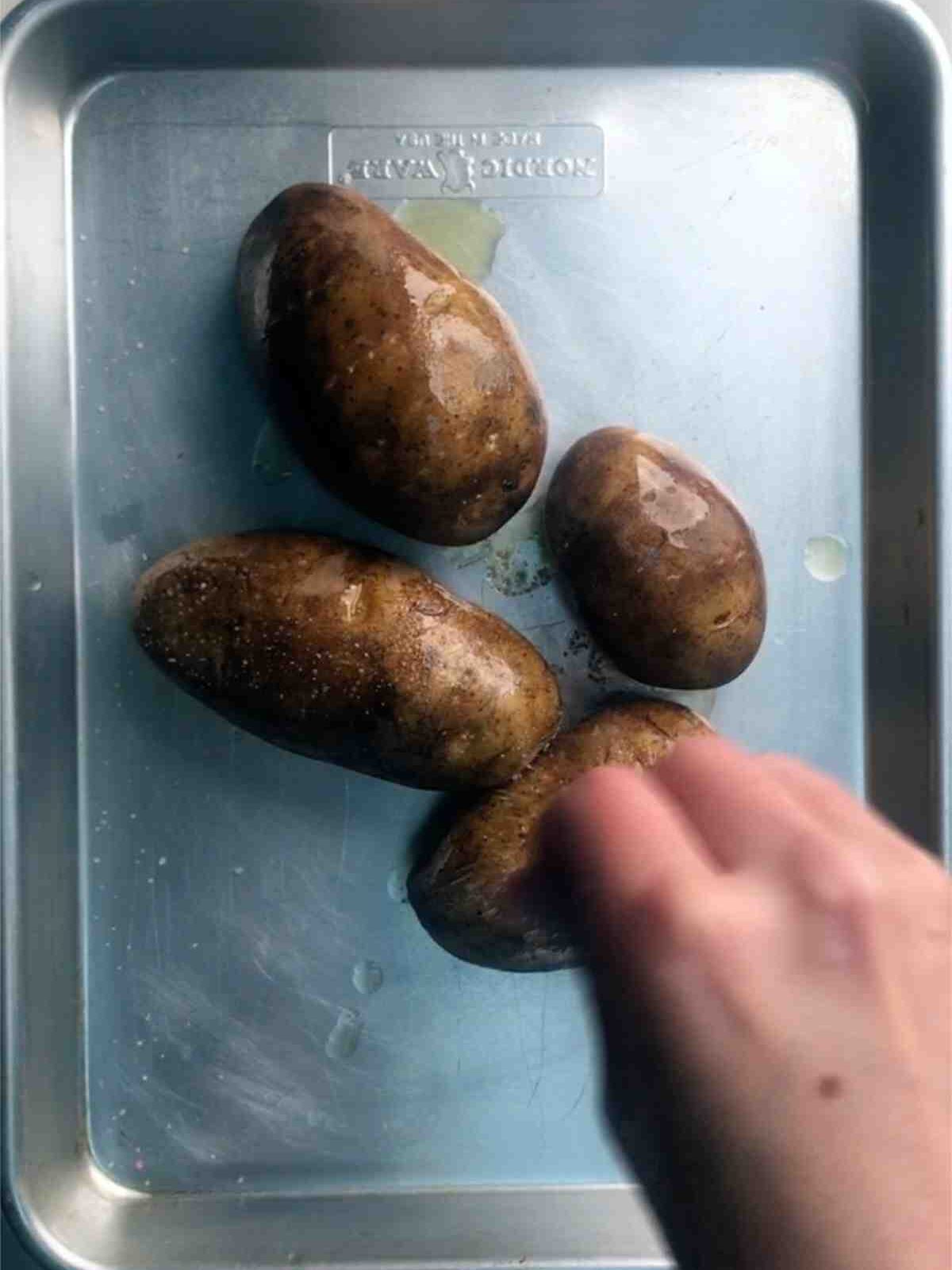 Preheat the oven to 400F. In the meantime, poke holes in the potatoes with a fork, coat them lightly in oil, and season them well with salt. Bake the potatoes for 1 hour.