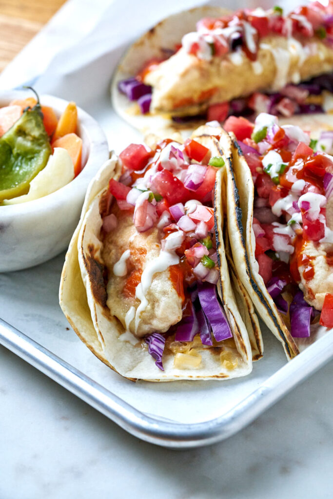 This method is really easy, and it only takes a few minutes to fry each fish fillet. When placed in the taco with the other ingredients, the crispy batter provides a tasty contrast with the flaky fish inside.