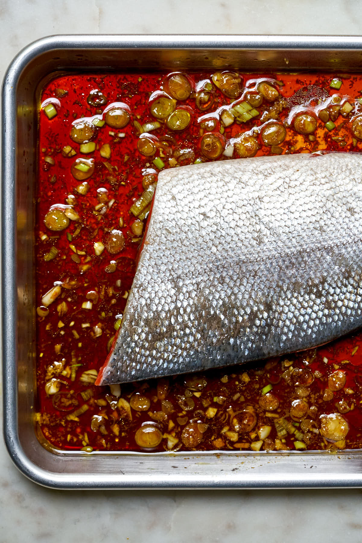 Add the olive oil, soy sauce, brown sugar, ginger, garlic, and scallions/shallot to a baking dish that fits your salmon (see photo 1). Place the salmon SKIN SIDE UP. This is the big trick in the recipe. It allows all the fat to seep into the salmon as it cooks. Also makes for easy skin removal (photo 2).