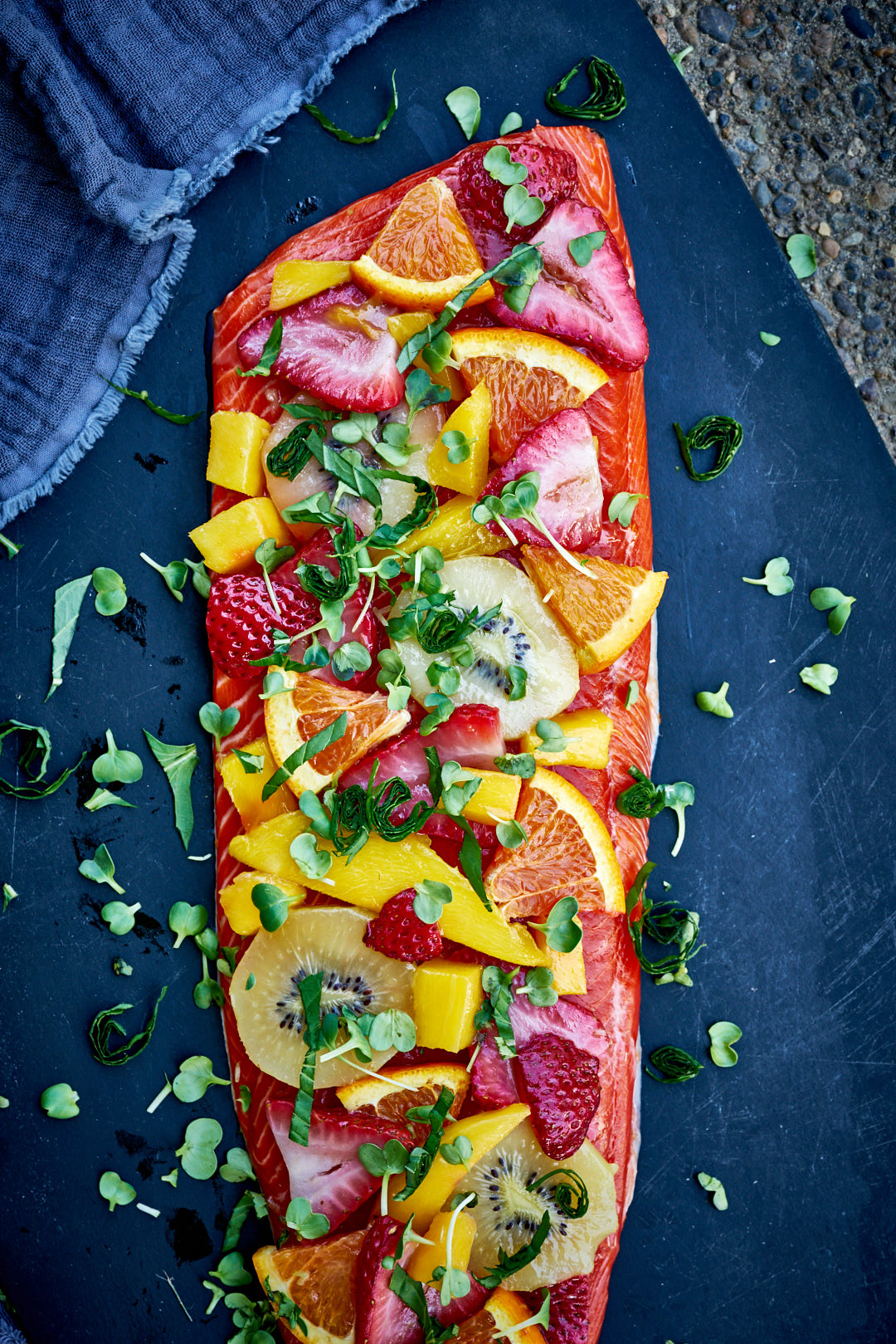 - Add the sockeye filet to a baking sheet. Season with the salt and pepper. Top with the fresh fruit. Drizzle the avocado oil over the fruit.
